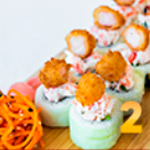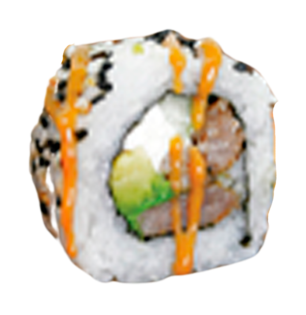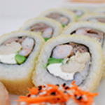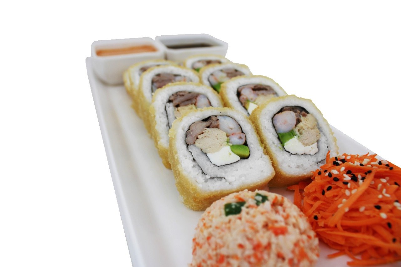 Sushi empanizado, por dentro lleva philadelphia, aguacate, pollo, res y tocino. Acompañado de zanahoria, tampico, salsa ponzu y aderezo chipotle.