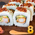 Philadelphia y aguacate, envuelto en hoja de pepino, topping de tampico y camarón empanizado.