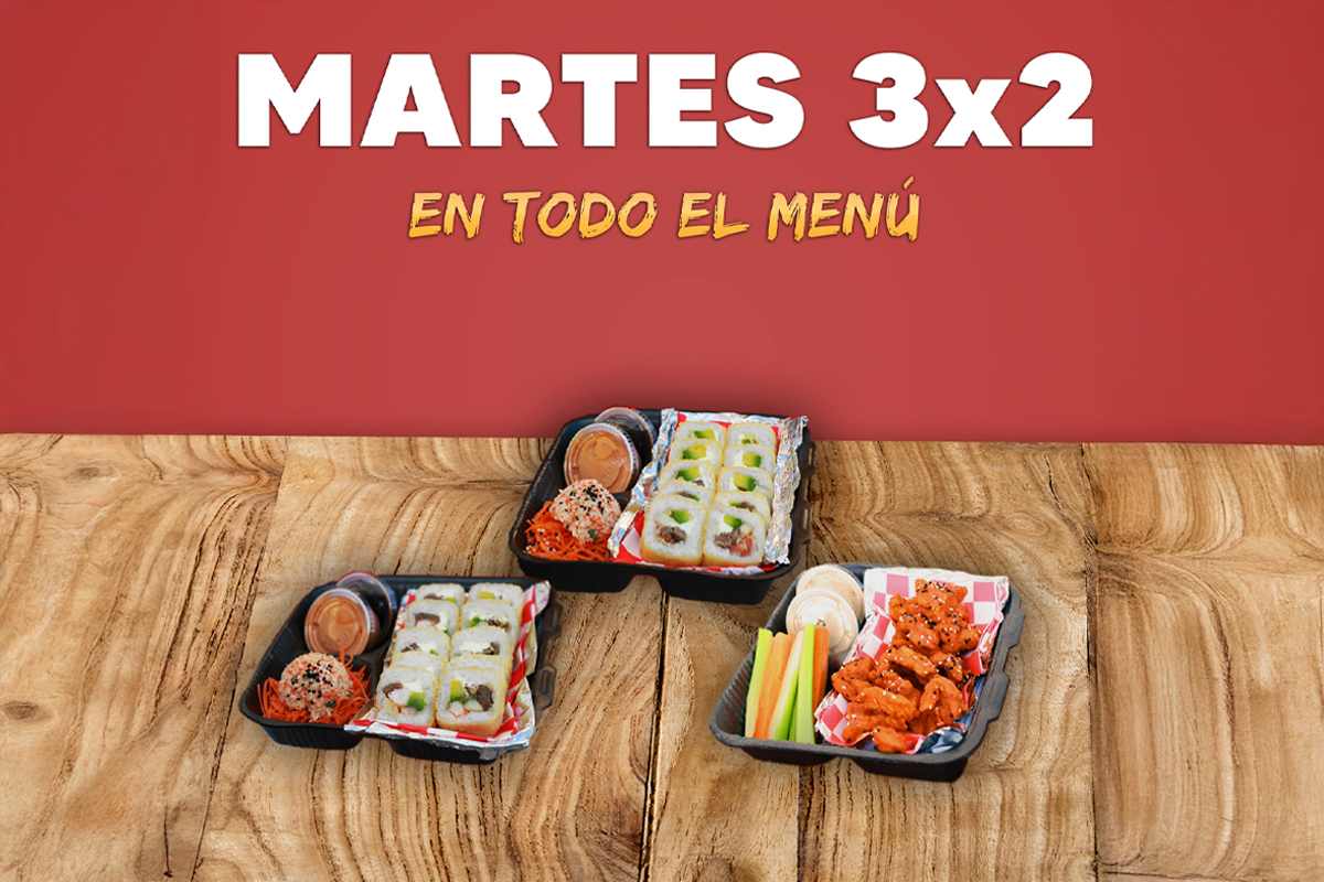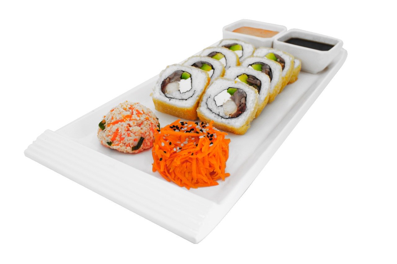 «Rollo empanizado, por dentro lleva philadelphia, aguacate, pollo, res y camarón. Acompañado de zanahoria, porción de tampico, salsa ponzu y aderezo chipotle.